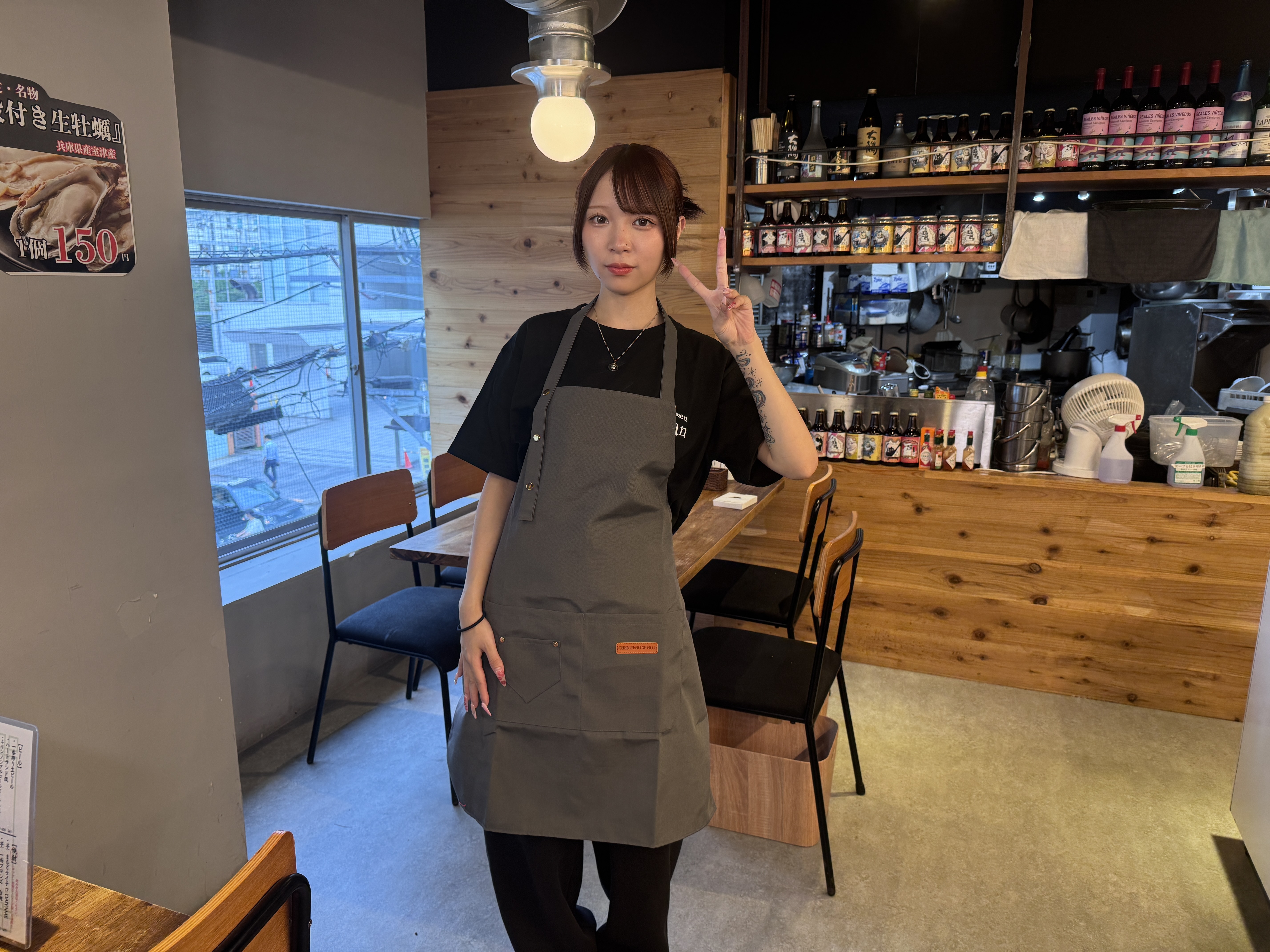 お店のオリジナルTシャツにエプロン! これはディナータイムの制服スタイル😼 ランチは帽子とマスク着用!