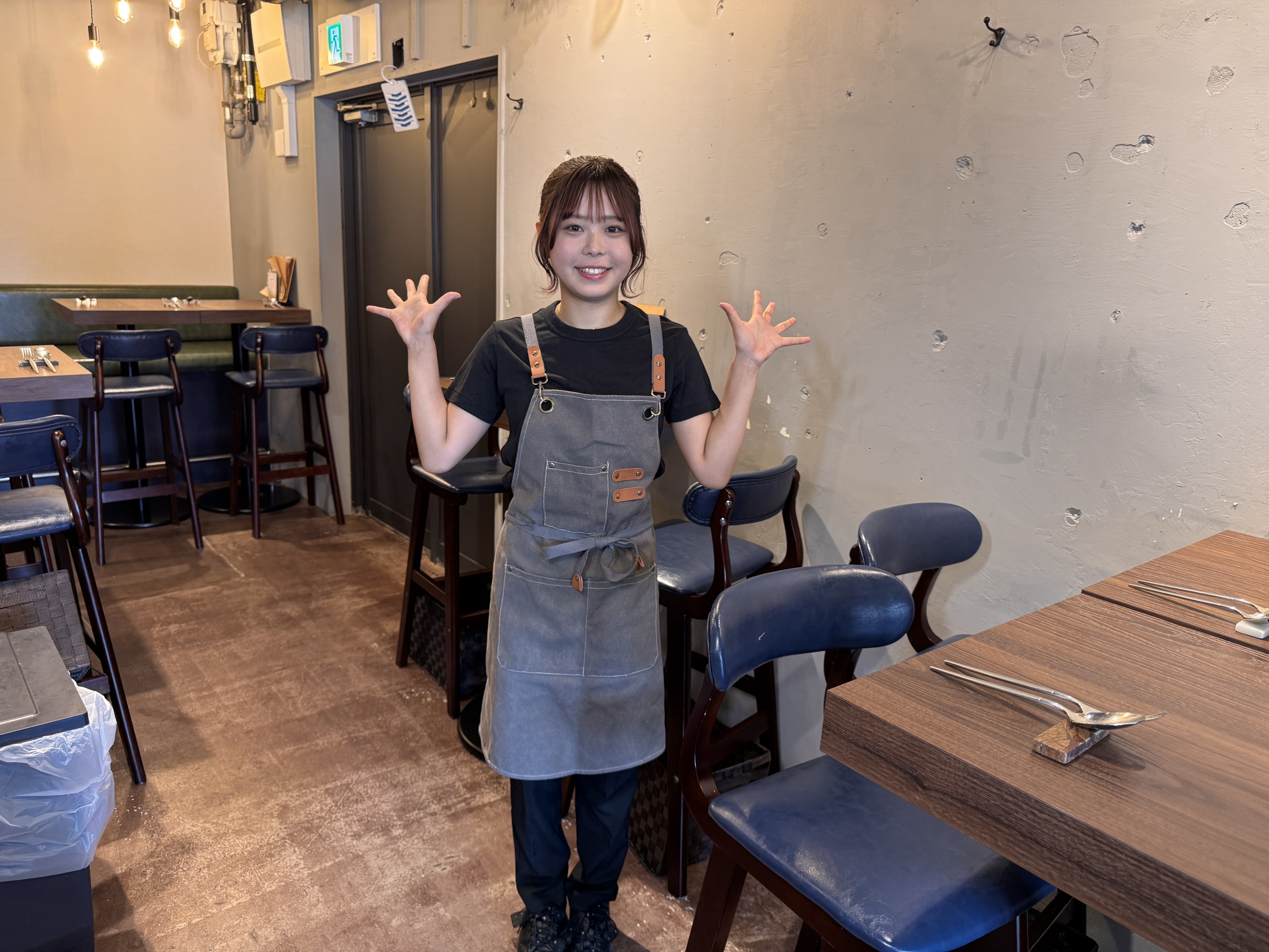 ホールとキッチンで制服は違うよ!ホールの蝶ネクタイとエプロンがかわいい🩵